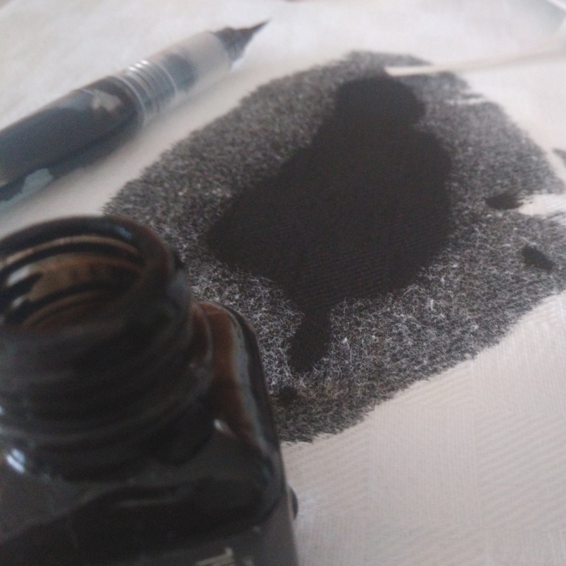 Une fois de plus, je suis partie bille en tête. J’ai rempli mon pinceau rechargeable d’encre de Chine, j’avais ma petite idée en tête… Et BIM ! Au détour d’un geste malencontreux, c’est le drame. Disons qu’on ne m’y reprendra plus.